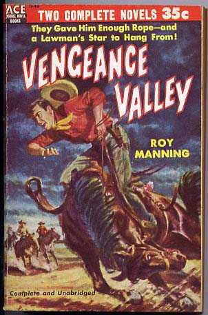 D-46 CHUCK MARTIN Law From Back Beyond (cover by Norman Saunders; 1954; listed as an "ACE Original") and D-46b ROY MANNING Vengeance Valley (cover by John Leone; 1954; listed as "Complete and Unabridged")