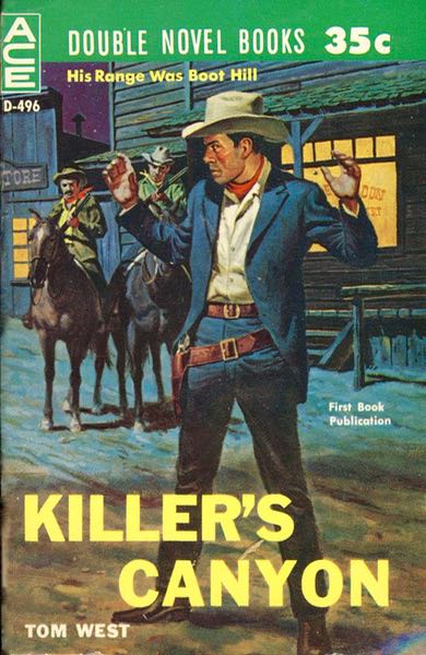 D-496 STEVEN G. LAWRENCE With Blood In Their Eyes (cover by Gerald McConnell; 1961; listed as "Complete Novel") and D-496b TOM WEST Killer's Canyon (1961; listed as "First Book Publication")