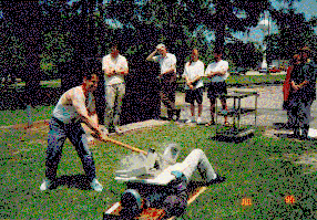 Gabriel, who is sandwiched between two beds of nails, shows no concern as EddieO pulverizes a cement block perched on one bed of nails resting on Gabriel's chest.