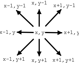 To keep things simple, we will assume that the drunkard's position is given by two int values, x and y. At each step, the drunkard can move in one of eight directions, chosen at random. This will change the values of x and y as shown in the diagram at the right.