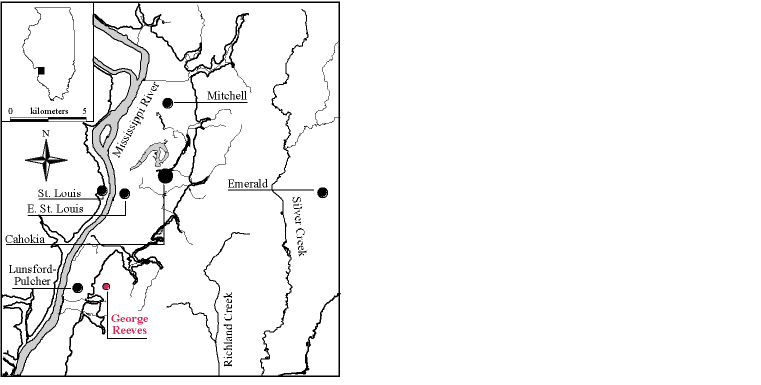 Map of the American Bottom region showing major mound centers and the George Reeves site, shown in red. George Reeves is in the bluffs overlooking the southern portion of the American Bottom. Modern St. Louis is directly on top of the St. Louis mound group shown in the map.