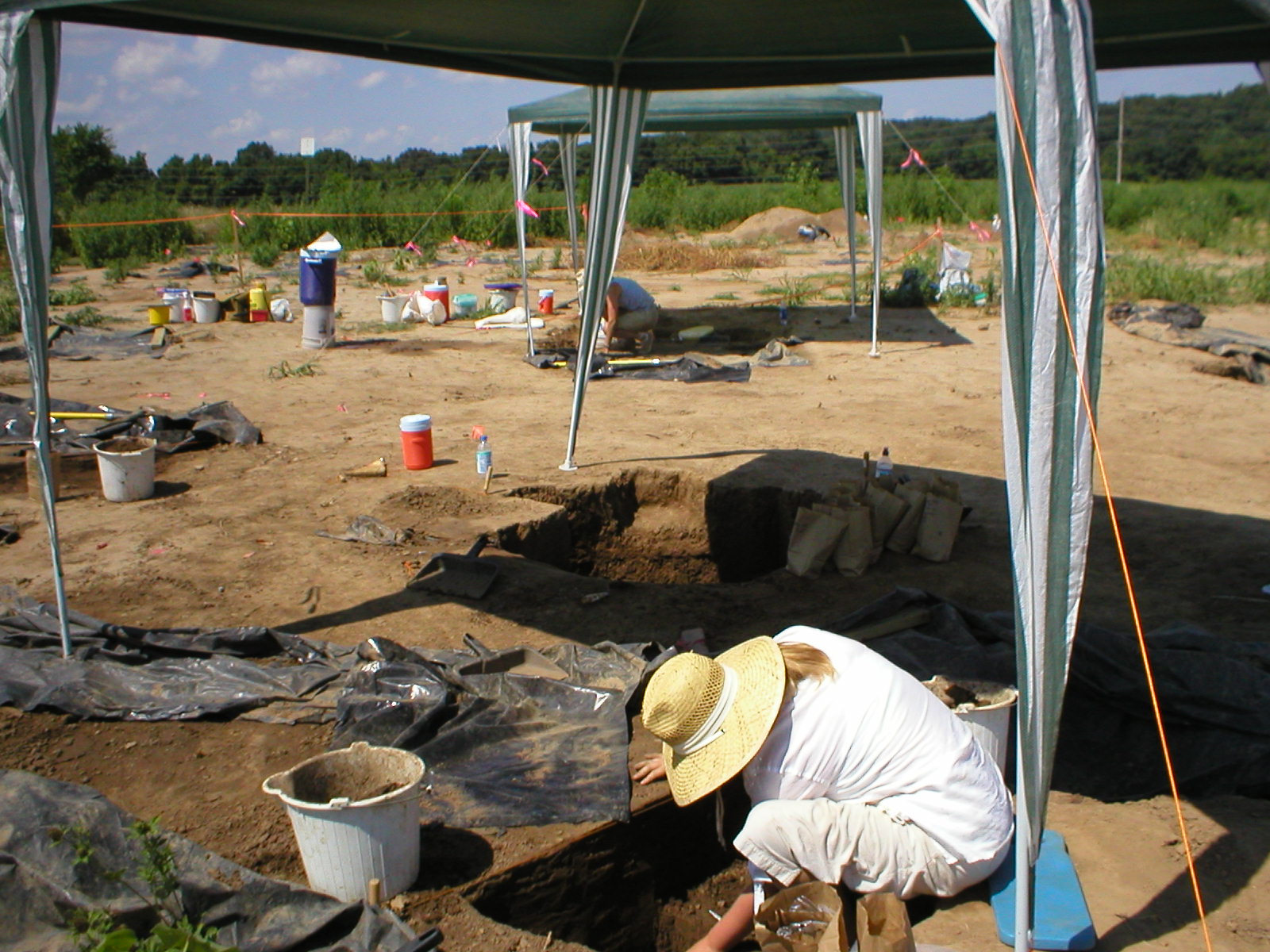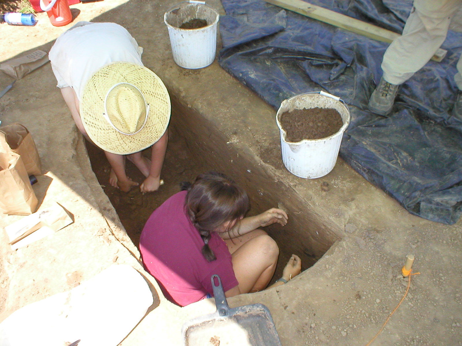 Kelly McCallister (left, in hat) and Claire Nanfro (sitting) digging an earth oven feature in the Summer 2003 American Bottom Field School. Photo taken by James Harrington.